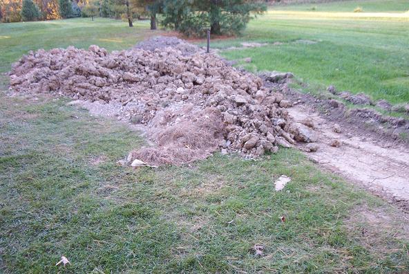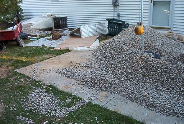 Waterproof remainder of wall, install remainder of filter fabric, insulate wall, and fill with gravel. Note that the vertical perforated drainage pipe connected to that along footer is to aid in radon gas venting. This pipe extends to just below the ground level and is capped and then covered. For information on radon gas removal, see Radon Gas Mitigation.