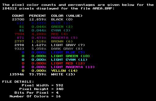 Load the photograph image file produced by the Digital Camera into Microsoft Paint. Select the background of known dimensions and click on "Edit" and then "Copy". Acquire the selected area by clicking on "File" followed by "New" and then "Edit" followed by "Paste". Write the acquired image to a 16 Color Bitmap file by clicking on "File" followed by "Save As..." and then select "16 Color Bitmap" in the "Save as type:" option. The image below is of the example above:Step 3: Execute Software Program To Determine Area