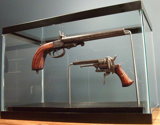 The information below shows and describes the Gun Display Case. The guns used in this demonstration are a Boissy Pinfire Double Barrel Pistol and a Belgium Liege Proof Marked Pinfire Revolver.The photo below shows the Gun Display Case for hand guns: