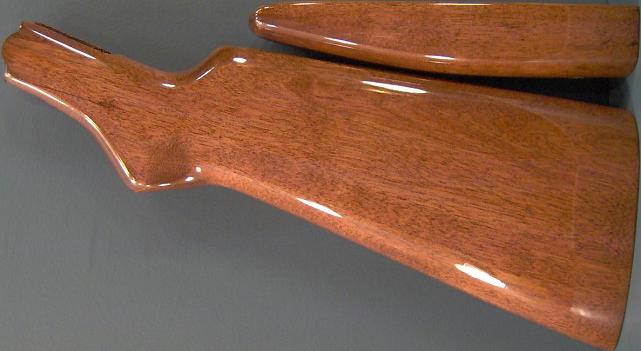 The photos below show the stock and forend after 10 applications of Minwax Wipe-On Poly Clear Gloss Polyurethane sanding lightly between coats with 800 grit sandpaper and synthetic wool: