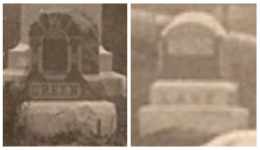 Closer examination of those circled areas of the old photo shows a stone for ‘GREEN’ on the left and a stone for ‘LANE’ on the right as shown below: