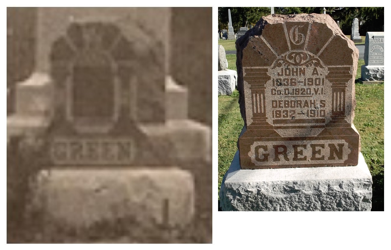The image in the old photo of the stone for 'GREEN' is given below (left) with the photo that was taken in recent years of the stone for ‘GREEN’ at the East Liberty Cemetery in East Liberty, Ohio (right):