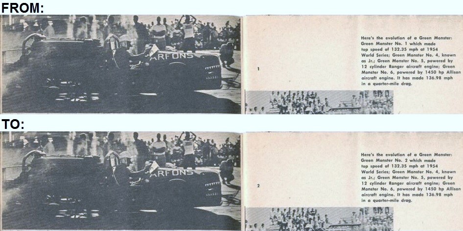 That is, change the number '1' to '2' in two places in the text above.Note too that the photo below shows Green Monster 1 as acquired from the July 1957 issue of Motor Guide magazine: