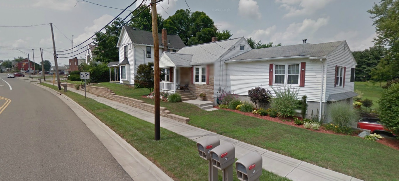 The house to the right in the Google Maps Car photo below from August 2011 is located at 2277 Greensburg Road. Notice that the terrain surrounding the house matches the terrain