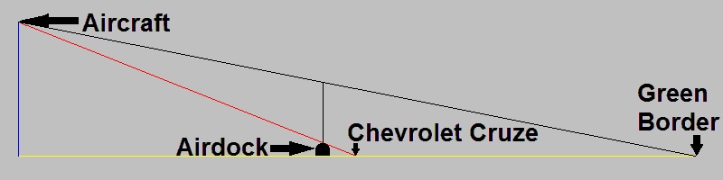 The distance from the Airdock to the Green border is 3.182 miles = 16,800.96 feet.