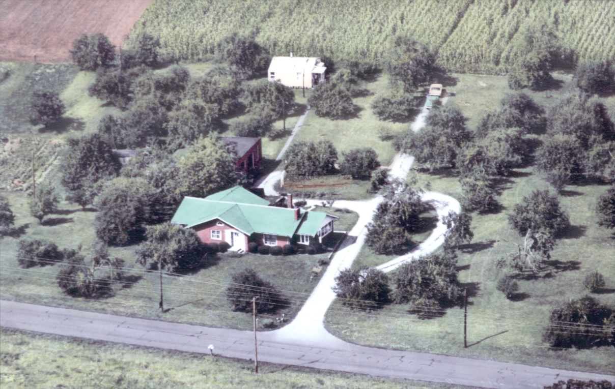 A 1985 aerial photo of Pontius Green Acres with the Farm House and Barn are shown below.