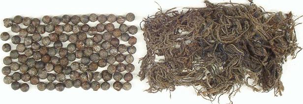 While cleaning the barrel of the Flint Miquelet to Percussion Conversion Shotgun, the author discovered that the gun was still loaded. The photo below shows the wadding and shot removed: