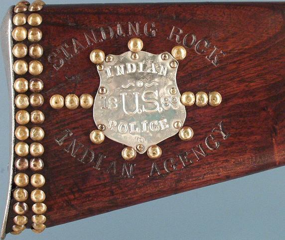The right side of the stock is stamped: "STANDING ROCK INDIAN AGENCY" with a silver plate stamped: "INDIAN 18 U.S. 89 POLICE" as shown in the photo below: