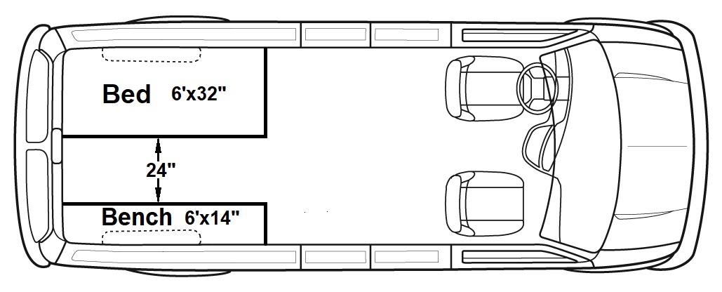 An excellent location and size of the bed and optional bench are shown in the graphic below and are set on top of the wheel wells (shown with dashed lines), which are typically 10 inches high: