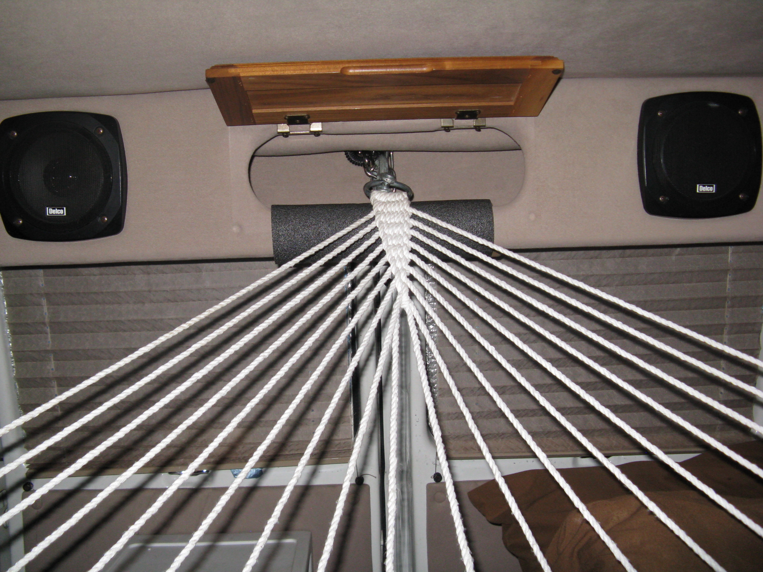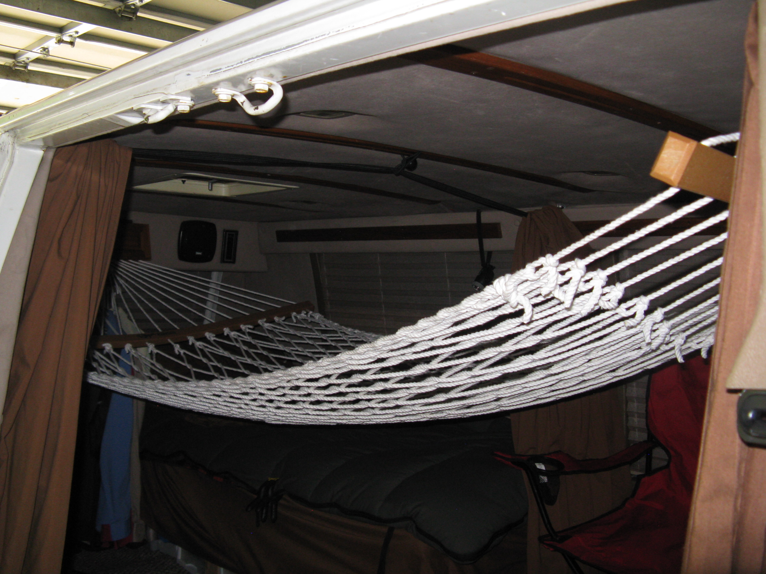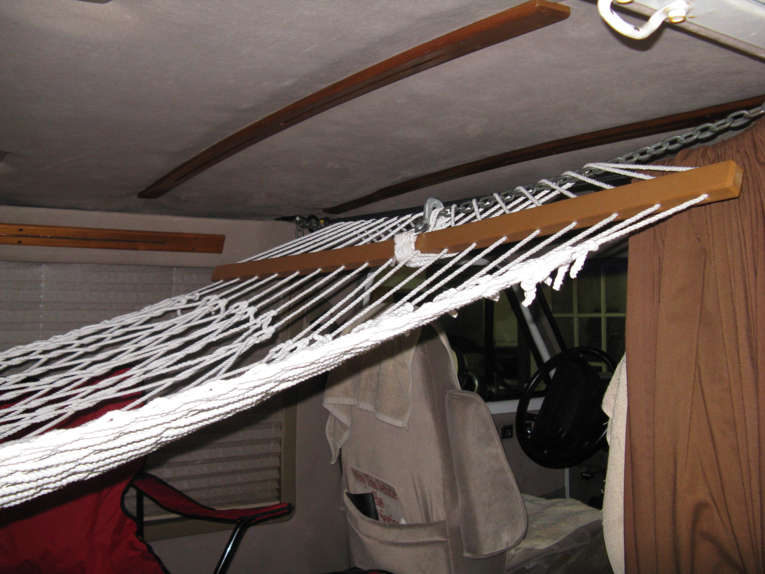 To see where to mount a hammock, see WHERE TO MOUNT A HAMMOCK.Having a hammock mounted inside your vehicle makes "Low Cost Luxury Living" cool, comfortable, and relaxing. A woven rope hammock with spreader bars is recommended to allow air to circulate around your entire body on hellishly hot and humid days and nights. Each end of the hammock needs to have heavy duty hooks installed to allow the hammock to be quickly installed and uninstalled. Such a hammock is shown mounted inside the vehicle in the photo below.