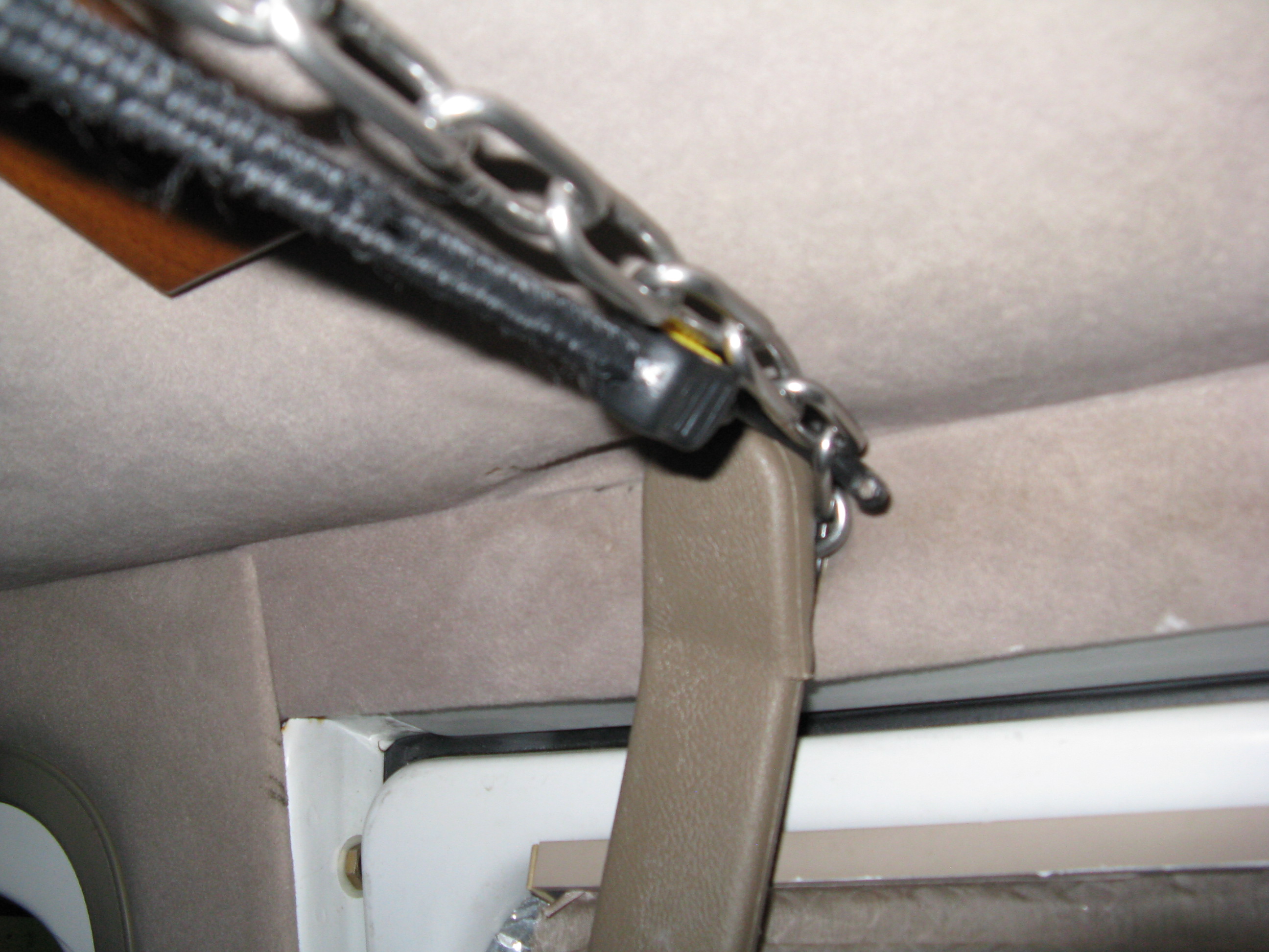 The other end of the hammock is hooked to a chain that has each end bolted to the roof edge with the two rear door latch bracket bolts as shown in the photo below.
