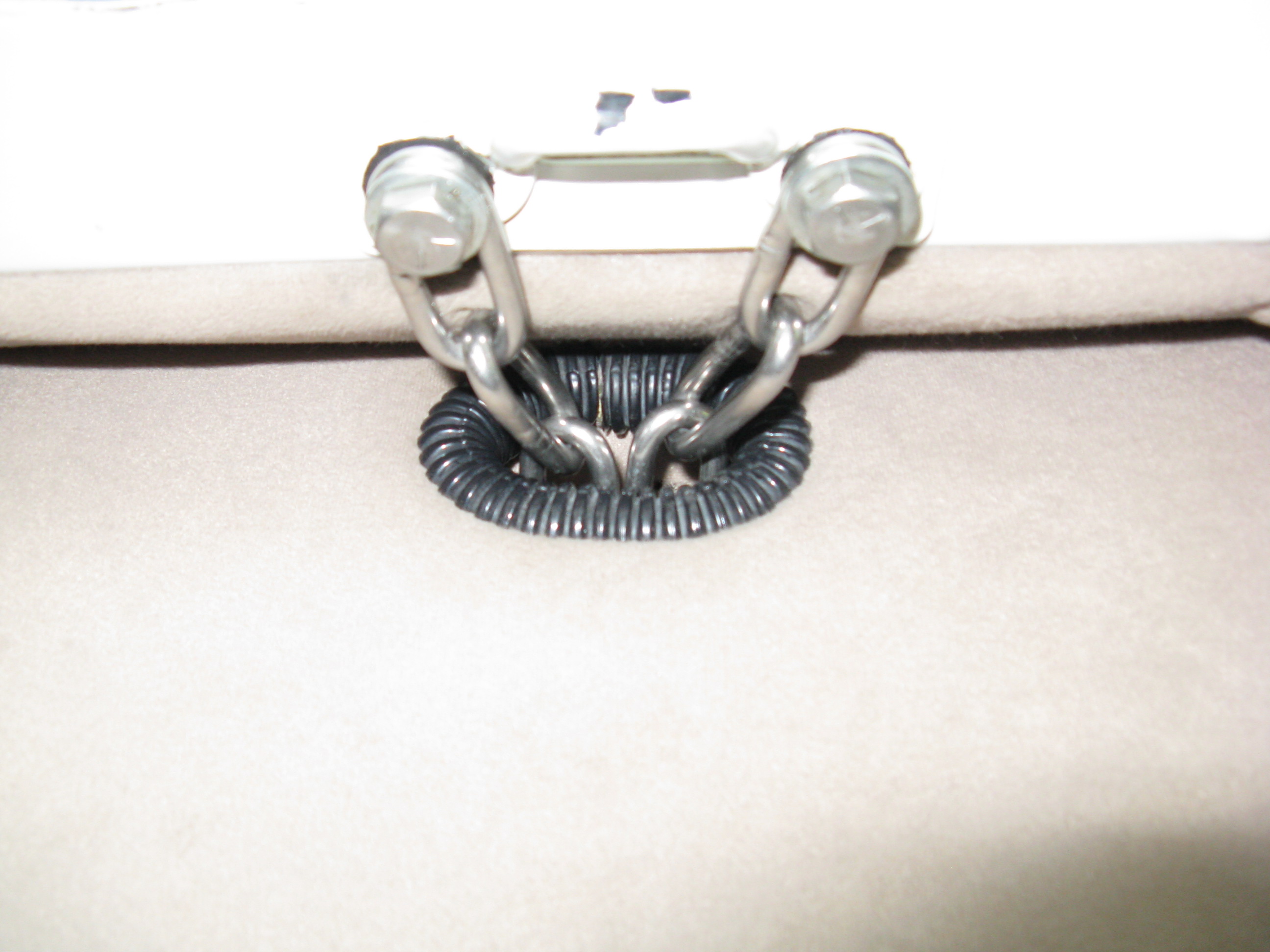 Notice that a hole needed to be drilled through the back of the small cabinet that is mounted above the two rear doors. The split black plastic wire conduit wrapped around the edge of the hole protects that edge from the chain that extends through the cabinet.