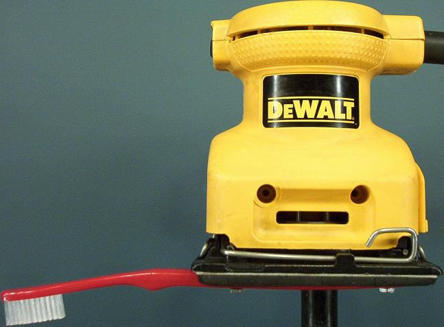 The gun metal is gently cleaned using high pressure water, boiling water, WD-40 (Water Displacement - 40th attempt), and a short bristled nylon brush (e.g. toothbrush). To prevent damaging the original aged finish, water and WD-40 are the only two solutions used to remove contaminants. High pressure water aids in removing rust scale. Boiling water is used to remove any corrosive salts that may remain from corrosive primers or black powder ammunition. Boiling water also aids in removing rust scale because the rust scale expands and contracts at a different rate than the metal. WD-40 is used to penetrate into, loosen, and flush away rust and other contaminants as well as displace any remaining water. No form of rust remover, abrasives, scrapers, electrolysis, etc. is used to prevent damaging the original aged finish.The brushing process is performed thoroughly and efficiently by bolting a nylon brush to a Palm Sander as shown in the photo below. Two brushes may be used. A firm bristle (0.009" diameter) brush is primarily for removing rust scale. A soft bristle (0.006" diameter) brush is primarily for removing rust from pits.