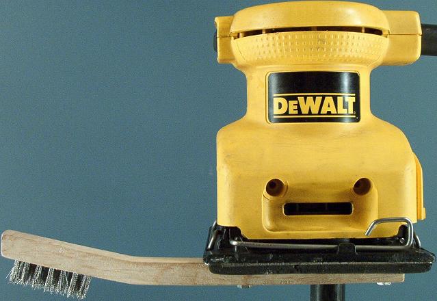 Optionally soak in WD-40 for 24 hours or longer and then carefully brush with fine bristled stainless steel brush for removing excessive rust scale that is not removed by above steps. The stainless steel brush may be attached to a Palm Sander as shown in the photo below: