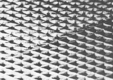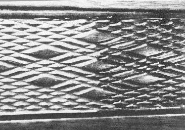 Impressed checkering is produced by stamping or rolling the stock with a hot die that impresses the diamond pattern into the wood. The wood does not burn because the process is performed quickly. The wood fibers are not crushed because the heat basically melts the wood lignin which is the substance that bonds the wood fibers together.There are two types of Impressed checkering. These are referred to as Positive and Negative Impressed checkering. Positive Impressed checkering produces diamonds that are projected above the lines. Negative Impressed checkering produces diamonds that are indentations below the lines. The photos below show these two types of Impressed checkering: