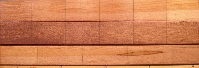 The photo below shows the flat side (bottom) stained with Dark Walnut (top section in photo) and Red Mahogany (bottom section in photo) after sanding with 320 and the far right section treated with Pre-Stain Wood Conditioner: