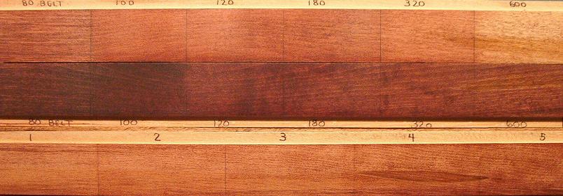 The photo below shows the results of Maple sanded with increasing grits of sandpaper, sanded and grain raised, and increasing number of applications using Minwax Red Mahogany (225) penetrating stain:1. Sand with coarser grit sandpaper.