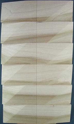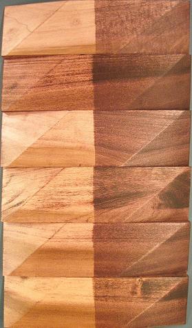 Maple and other similar types of wood, for example Poplar, are very poor at absorbing stain uniformly. Pre-Stain Wood Conditioners and various types of stain are available to improve uniform stain absorbtion. The left photo below shows six sections of multi-color Poplar cut from the same board that have been cut at 10 degrees depth and height on the ends to expose end grain, sanded with 320 grit sandpaper, and then the right side dipped in water and allowed to dry to raise the grain. The right photo below shows the same sections after performing the various staining operations described below the photos: